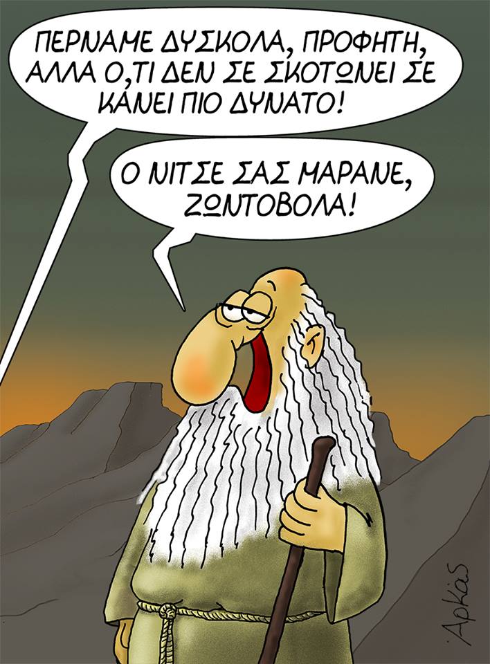 Ο γνωστός σκιτσογράφος, απαντά αιχμηρά μέσω του προφήτη σε έναν πολίτη, που του λέει μία γνωστή ρήση του Φρ. Νίτσε, σε ένα σκίτσο που θα συζητηθεί!