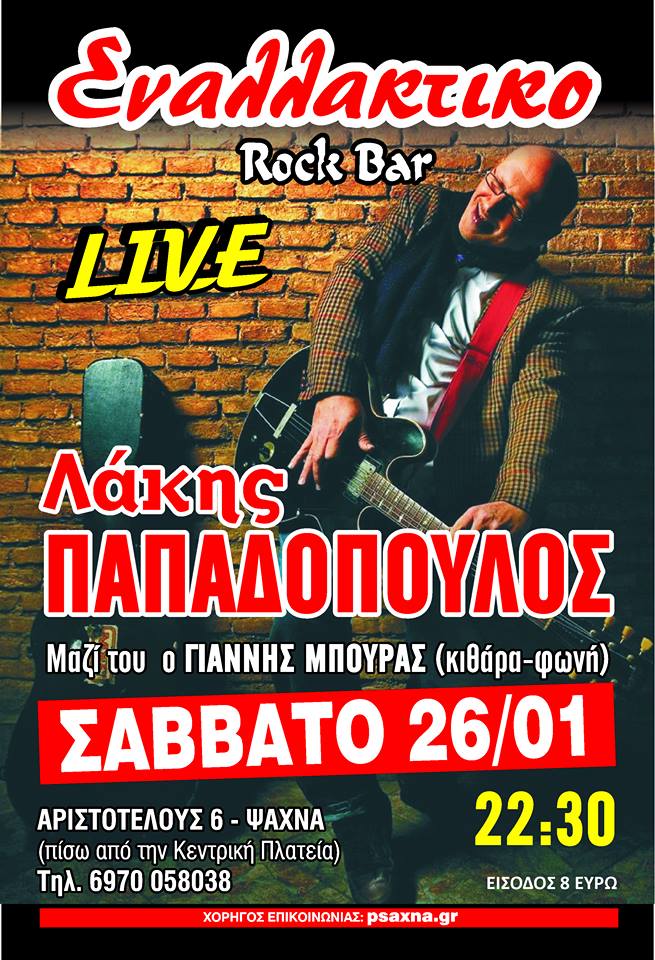 O Λάκης Παπαδόπουλος αλλά και «Λάκης με τα ψηλά ρεβέρ» εμφανίζεται το Σάββατο 26 Ιανουαρίου στο Εναλλακτικό, ερμηνεύοντας τραγούδια απ` την πολυετή και τόσο σημαντική μουσική του διαδρομή στο ελληνικό τραγουδι (Για να σ`εκδικηθώ,Σε ζητάω,Τα μπλε