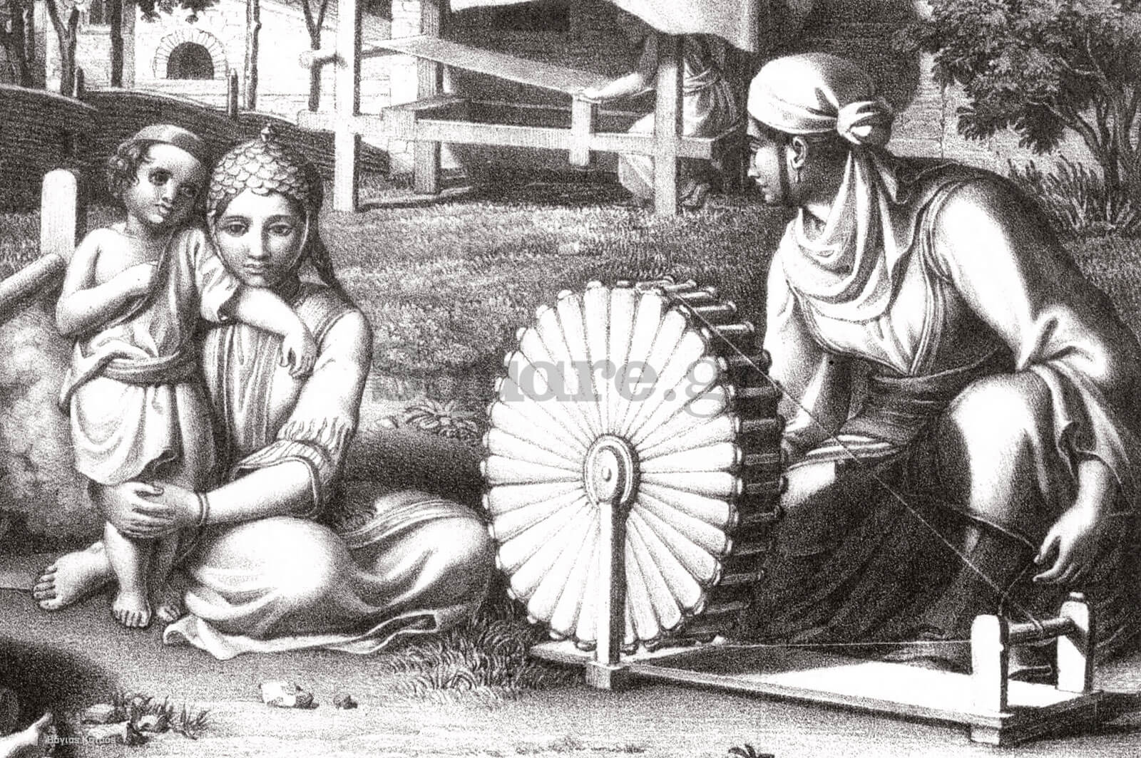 Η καθημερινότητα μιας Ευβοϊκής οικογένειας επί Τουρκοκρατίας. Λεπτομέρεια από σχέδιο του Otto Magnus von Stackelberg, από το έργο Trachten und Gebrauche der Neugriechen… 1831. Πηγή: «Χαρακτικά της Εύβοιας. Συλλογή Γιάννη Κ. Καράκωστα, Ε.Ε.Σ., Αθήνα 1999».