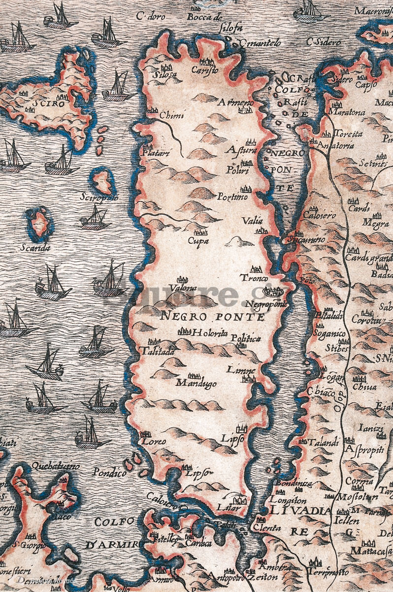Χάρτης της Εύβοιας, Simon Pinargenti, 1573. Τίτλος «Negro Ponte». Πηγή: «Χαρακτικά της Εύβοιας. Συλλογή Γιάννη Κ. Καράκωστα, Ε.Ε.Σ., Αθήνα 1999».
