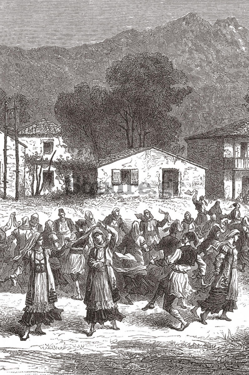 Πανηγύρι στην Εύβοια. Λεπτομέρεια από σχέδιο του Amand Freiherr von Schweige-Lerchenfeld, από το έργο του Griechenland in Wort und Bild, 1882. Πηγή: «Χαρακτικά της Εύβοιας. Συλλογή Γιάννη Κ. Καράκωστα, Ε.Ε.Σ., Αθήνα 1999».