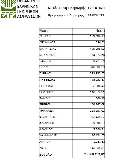 Το συνολικό ποσό των 26.008.767,87 ευρώ θα καταβάλλει την Παρασκευή 1 Φεβρουαρίου, στους λογαριασμούς 18.848 δικαιούχων αγροτών και κτηνοτρόφων ο ΕΛΓΑ.