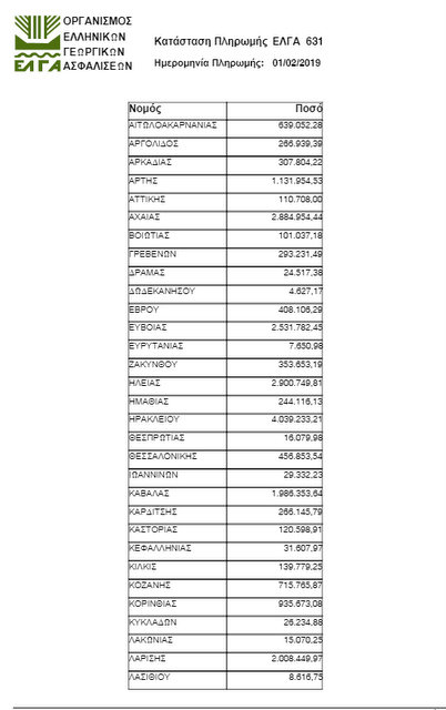 Αρκετά μεγάλο είναι το ποσό και για την Εύβοιας, αφού ανέρχεται σε 2.531.782 ευρώ. Αναλυτικά η λίστα me τις πληρωμές ανά νομό είναι η εξής:
